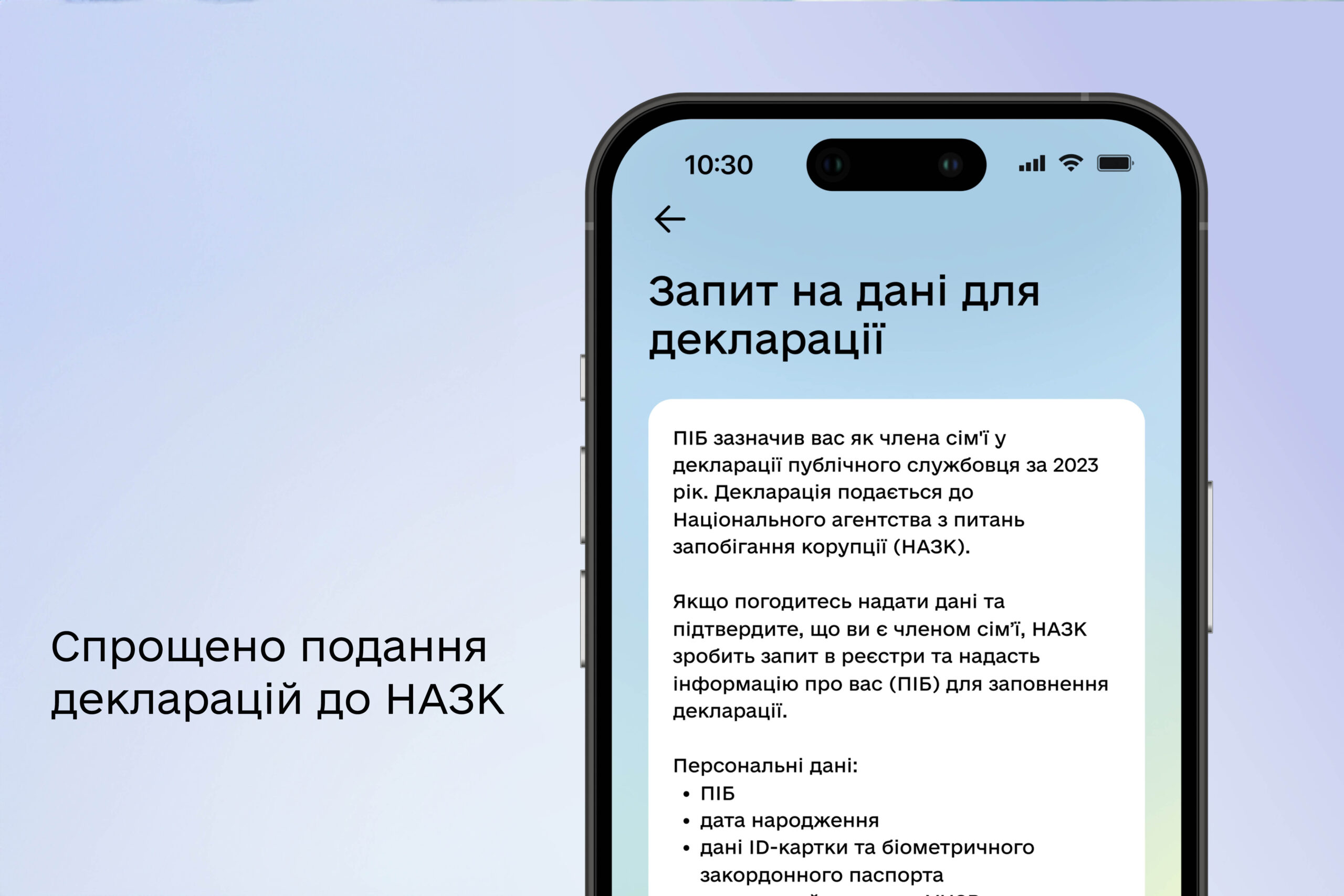 Відтепер члени сімей публічних службовців можуть погодити передачу своїх даних для заповнення декларацій у декілька кліків у застосунку Дія. Для цього потрібно у Дії підтвердити належність до члена сім’ї декларанта і передачу декларанту даних про себе. А Національне агентство запобігання корупції (НАЗК) збере всю необхідну інформацію і передасть декларанту.