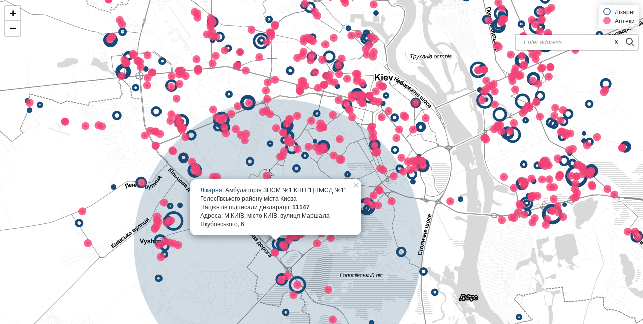 Зокрема, інструмент показує, скільки пацієнтів із деклараціями обслуговує той чи інший заклад та чи достатньо в радіусі 7 кілометрів від нього аптек, що працюють за програмою «Доступні ліки».