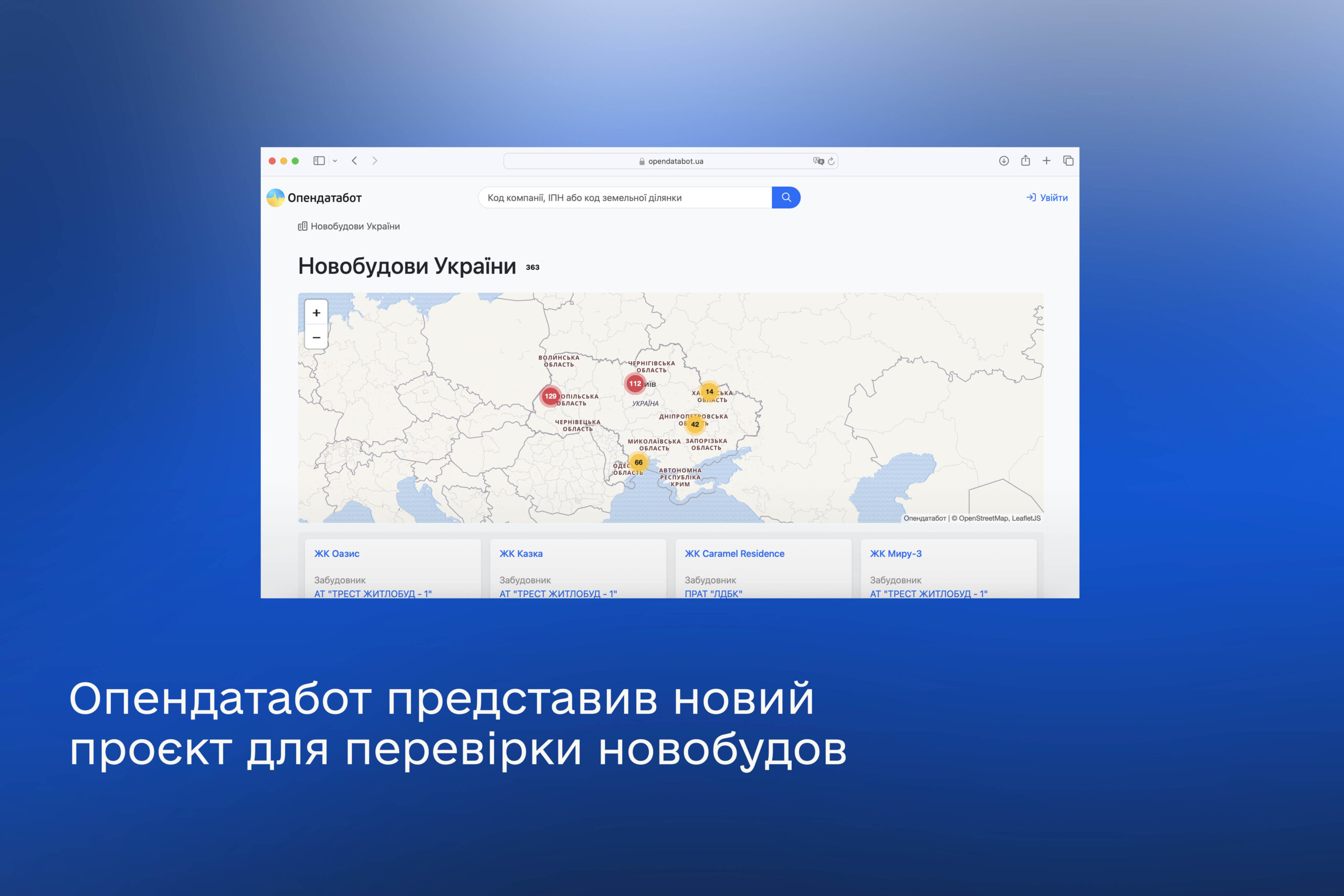 Завдяки аналізу новобудов України розробники з’ясували, що 54 % житлових комплексів мають судові процеси щодо земельних ділянок. Виявити наявні проблеми та потенційні порушення допоміг «Опендатабот. Корупційні ризики новобудов»