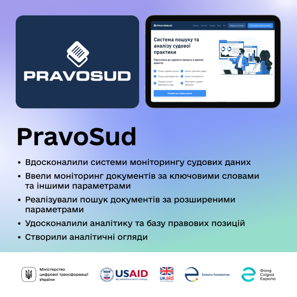 - PravoSud — система пошуку та аналізу судової практики, яка допомагає зробити ці дані більш доступними та зрозумілими для громадян і професіоналів галузі.