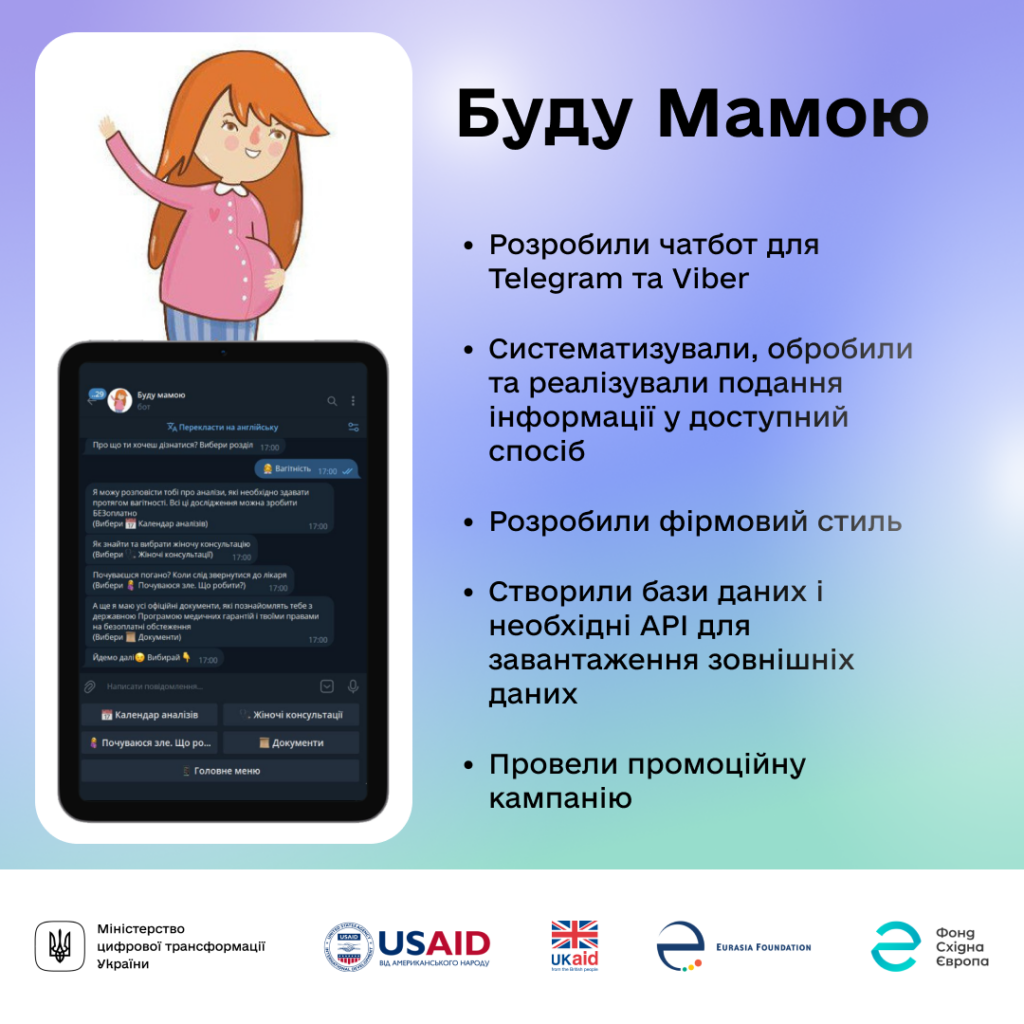- «Буду мамою» від Ліки Контроль та БФ «280 днів» — чат-бот, який надає підтримку та інформацію жінкам в репродуктивному віці, які тільки планують або вже є вагітними.