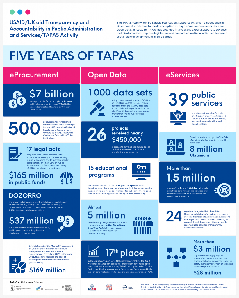 Since 2016, TAPAS has provided financial and expert support to advance technical solutions, improve legislation, and conduct educational activities to ensure sustainable development in public procurement, open data and e-services.